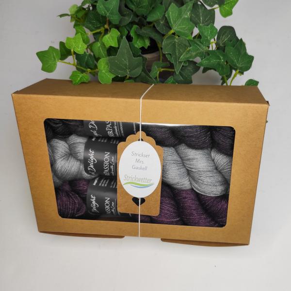 Das Rundum-Sorglos-Paket: Hier bekommt ihr die Strickanleitung für das Tuch Mrs. Gaskell inklusive der passenden Wolle. Das Set erhaltet ihr verpackt in einem kleinen Geschenkkarton inkl. dem Anleitungsheft und einem kleinen Lesezeichen. Toll auch als Geschenk geeeignet.