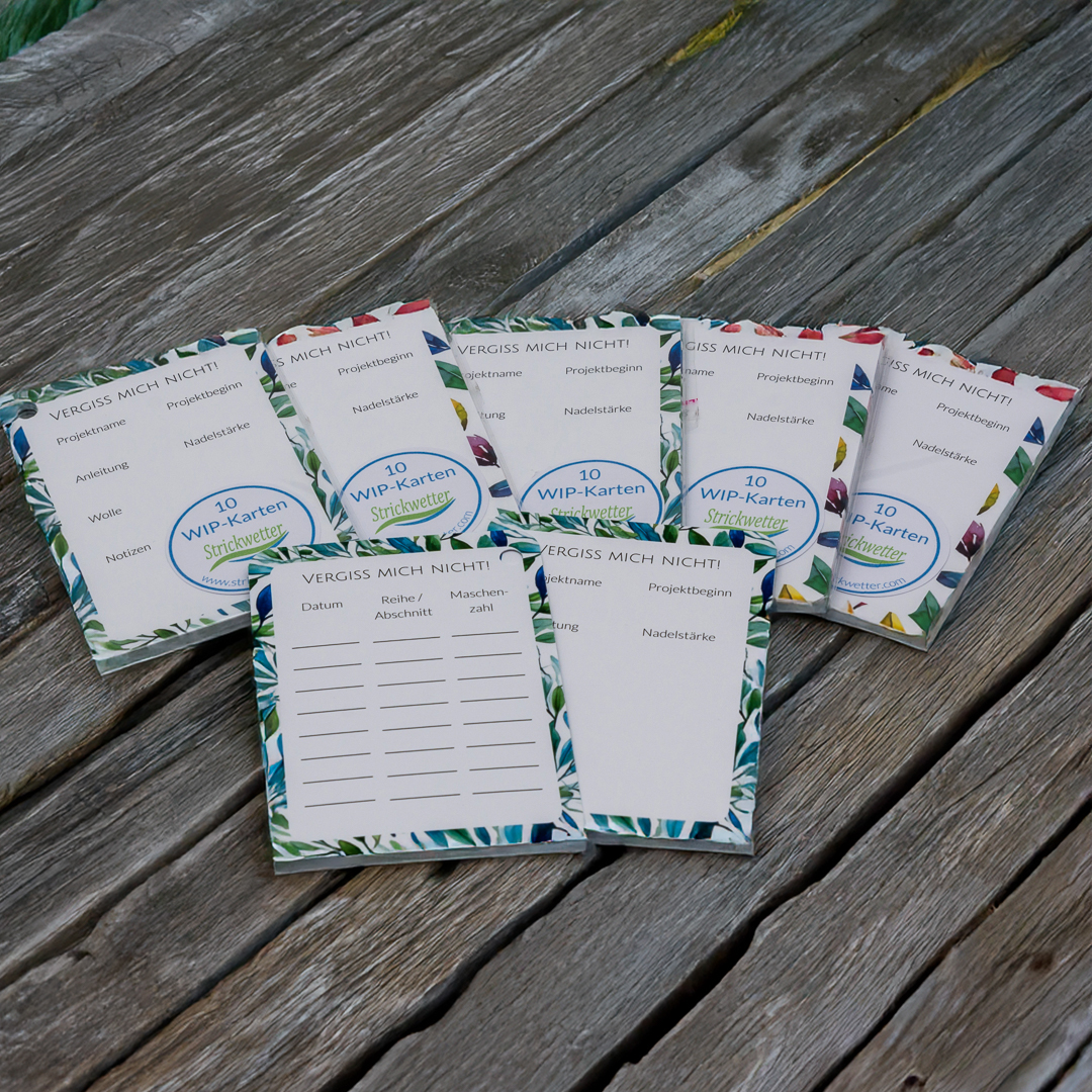 Mit diesen schönen WIP-Kärtchen behältst du die Übersicht über alle wichtigen Infos und Details deiner angefangenen Strickprojekte.